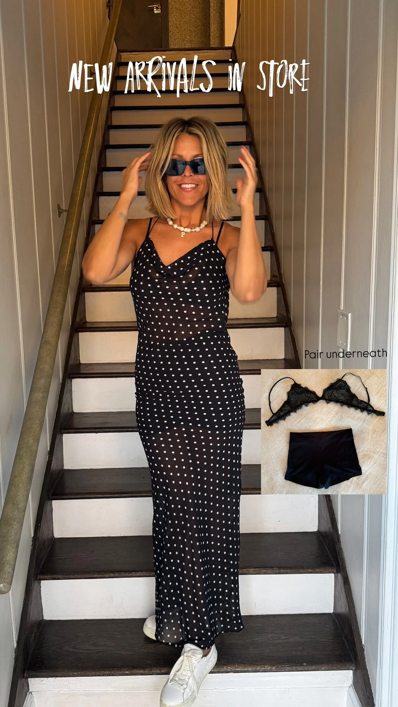 Adjustable see through black dress with white polka dots. Pair with a bralette underneath with a pair of mini black shorts.